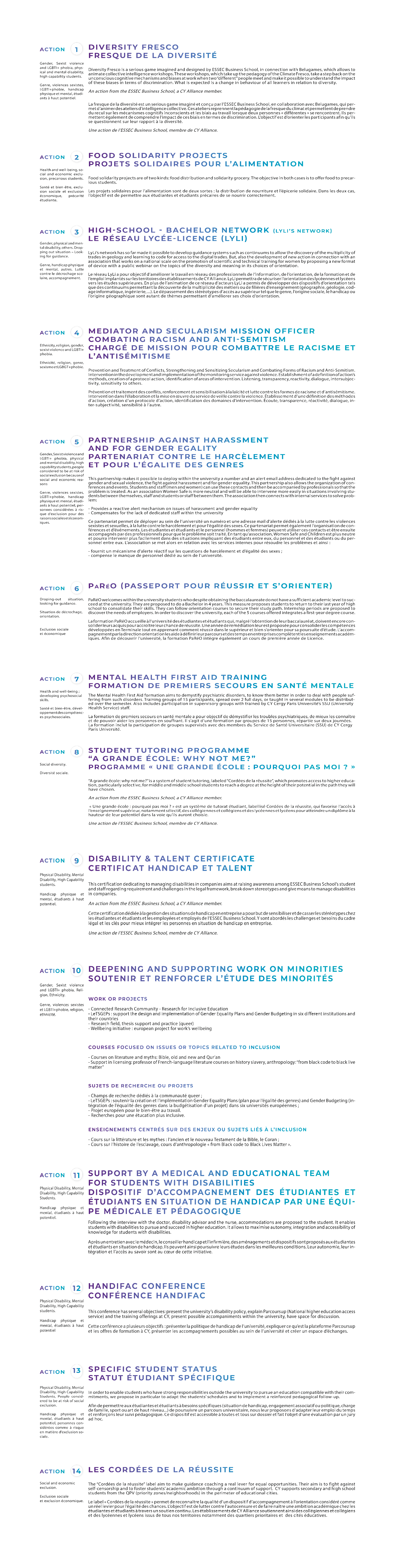 L’action n°5 se concentre sur la correction des facteurs d’exclusion tout en favorisant l’inclusion, une action centrale inscrite dans les valeurs de CY Sup. Elle se traduit au sein de l’école par le développement d’une vision commune de l’inclusion; entre les élèves du secondaire; les étudiantes et les étudiants de l’université; nos établissements et nos partenaires. Cette vision se consolide à travers l’animation d’un réseau d’acteurs interne et externe de l’inclusion et la réalisation d’enquêtes auprès des publics cibles.